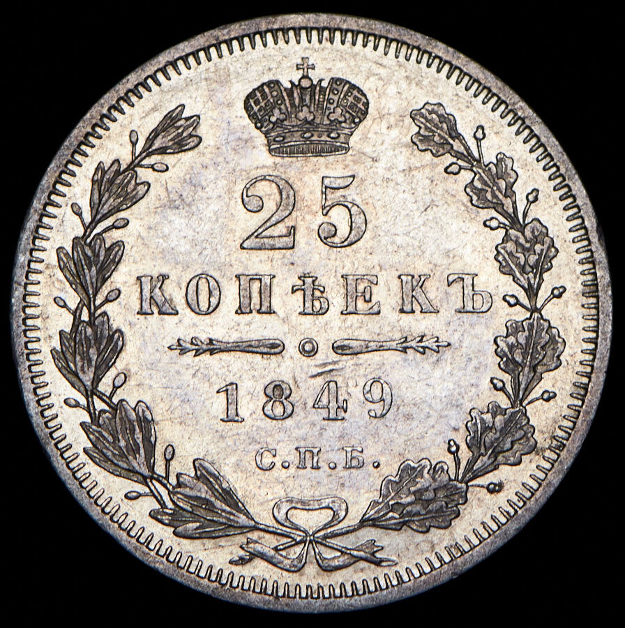 В центре указан номинал «25». Над цифрой – Корона Российской империи. Под цифрой номинала — слово "КОПЕЕК". Ниже, расположен декоративный разделитель в виде двух разнонаправленных фигурных линий и небольшой окружности между ними, в центре которой, выпуклая точка. Под разделителем — дата выпуска монеты «1849». Под цифрой даты — обозначение монетного двора «С.П.Б.». Вдоль канта, не доходя до короны, изображен венок из лавровой и дубовой ветви, которые в нижней части перевязаны лентой на узел бантом. По окружности канта имеются рельефные элементы, выполненные в виде зубцов.