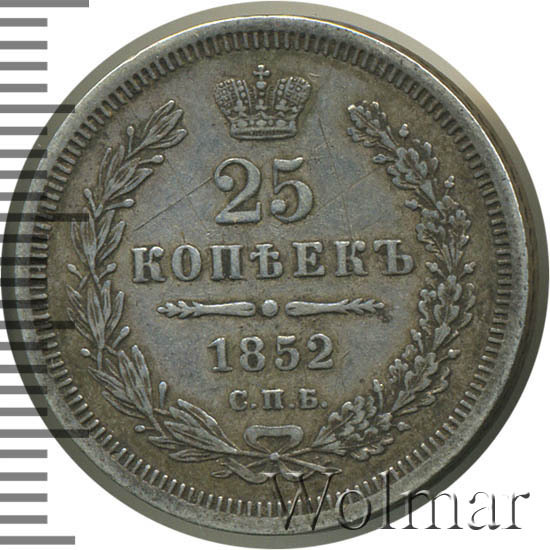В центре указан номинал «25». Над цифрой – Корона Российской империи. Под цифрой номинала — слово "КОПЕЕК". Ниже, расположен декоративный разделитель в виде двух разнонаправленных фигурных линий и небольшой окружности между ними, в центре которой, выпуклая точка. Под разделителем — дата выпуска монеты «1852». Под цифрой даты — обозначение монетного двора «С.П.Б.». Вдоль канта, не доходя до короны, изображен венок из лавровой и дубовой ветви, которые в нижней части перевязаны лентой на узел бантом. По окружности канта имеются рельефные элементы, выполненные в виде зубцов.
