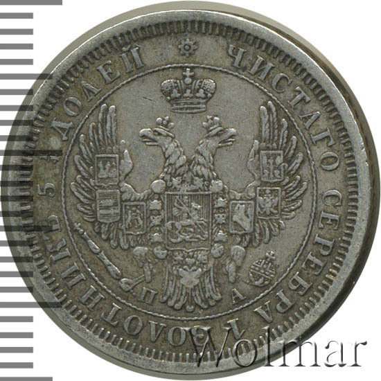 Аверс монеты 25 копеек 1852 года СПБ-ПА