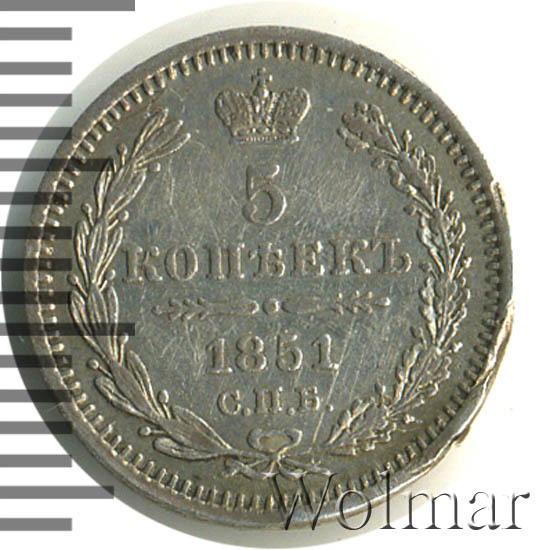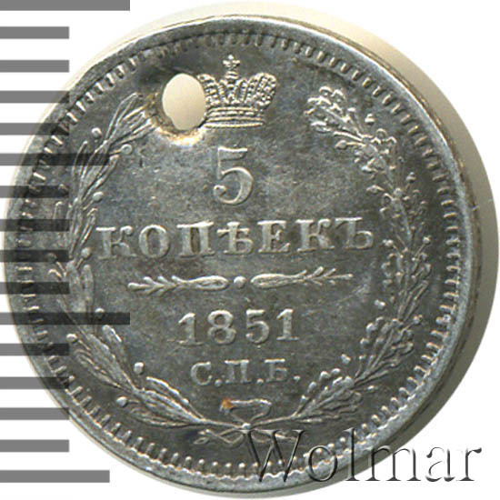 В центре указан номинал «5». Над цифрой – Корона Российской империи. Под цифрой номинала — слово "КОПЕЕК". Ниже, расположен декоративный разделитель в виде двух разнонаправленных фигурных линий и небольшой выпуклой точки между ними. Под разделителем — дата выпуска монеты «1851». Под цифрой даты — обозначение монетного двора «С.П.Б.». Вдоль канта, не доходя до короны, изображен венок из лавровой и дубовой ветви, которые в нижней части перевязаны лентой на узел бантом. По окружности канта имеются рельефные элементы, выполненные в виде зубцов.