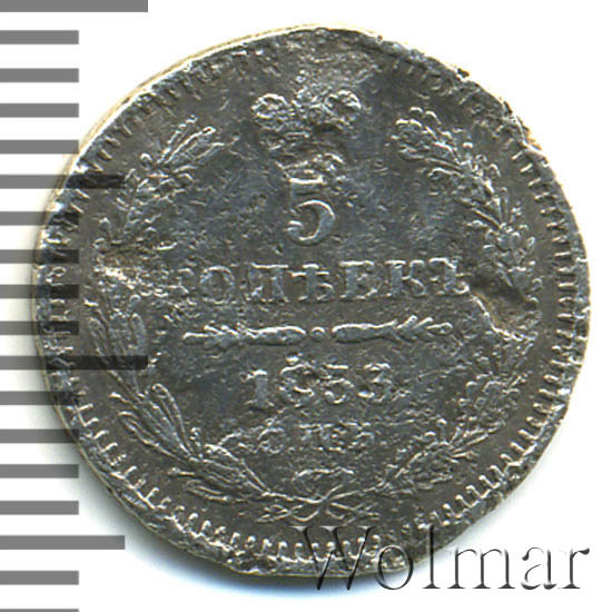 В центре указан номинал «5». Над цифрой – Корона Российской империи. Под цифрой номинала — слово "КОПЕЕК". Ниже, расположен декоративный разделитель в виде двух разнонаправленных фигурных линий и небольшой выпуклой точки между ними. Под разделителем — дата выпуска монеты «1853». Под цифрой даты — обозначение монетного двора «С.П.Б.». Вдоль канта, не доходя до короны, изображен венок из лавровой и дубовой ветви, которые в нижней части перевязаны лентой на узел бантом. По окружности канта имеются рельефные элементы, выполненные в виде зубцов.