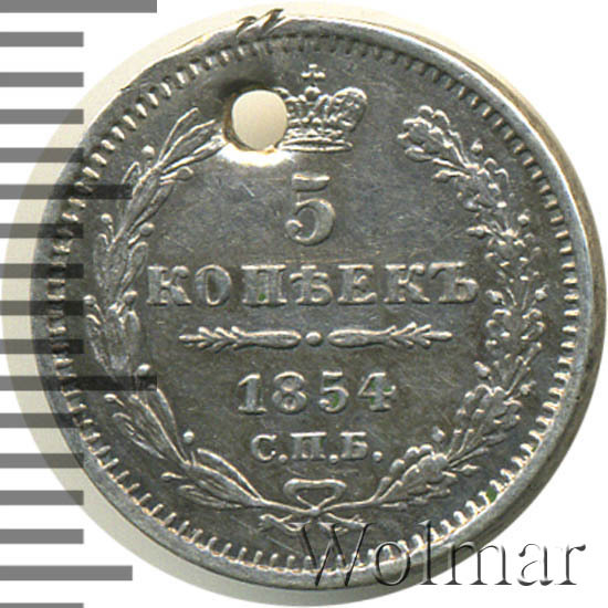 В центре указан номинал «5». Над цифрой – Корона Российской империи. Под цифрой номинала — слово "КОПЕЕК". Ниже, расположен декоративный разделитель в виде двух разнонаправленных фигурных линий и небольшой выпуклой точки между ними. Под разделителем — дата выпуска монеты «1854». Под цифрой даты — обозначение монетного двора «С.П.Б.». Вдоль канта, не доходя до короны, изображен венок из лавровой и дубовой ветви, которые в нижней части перевязаны лентой на узел бантом. По окружности канта имеются рельефные элементы, выполненные в виде зубцов.