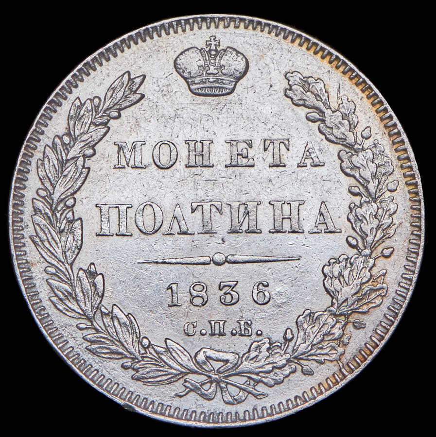 В центре указан номинал «МОНЕТА ПОЛТИНА» в две строки. Над номиналом – Корона Российской империи. Под номиналом расположен декоративный разделитель в виде двух разнонаправленных фигурных линий и небольшой окружности между ними, в центре которой, выпуклая точка. Под разделителем — дата выпуска монеты «1836». Под цифрой даты — обозначение монетного двора «С.П.Б.». Вдоль канта, не доходя до короны, изображен венок из лавровой и дубовой ветви, которые в нижней части перевязаны лентой на узел бантом. По окружности канта имеются рельефные элементы, выполненные в виде зубцов.