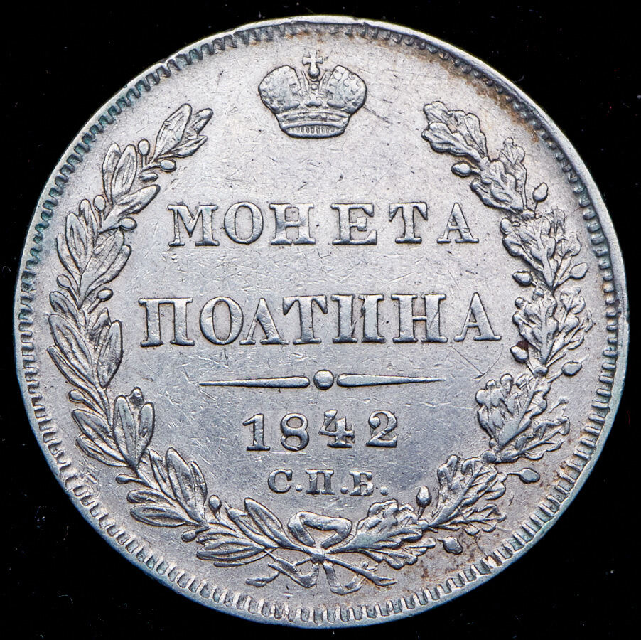 В центре указан номинал «МОНЕТА ПОЛТИНА» в две строки. Над номиналом – Корона Российской империи. Под номиналом расположен декоративный разделитель в виде двух разнонаправленных фигурных линий и небольшой окружности между ними, в центре которой, выпуклая точка. Под разделителем — дата выпуска монеты «1842». Под цифрой даты — обозначение монетного двора «С.П.Б.». Вдоль канта, не доходя до короны, изображен венок из лавровой и дубовой ветви, которые в нижней части перевязаны лентой на узел бантом. По окружности канта имеются рельефные элементы, выполненные в виде зубцов.