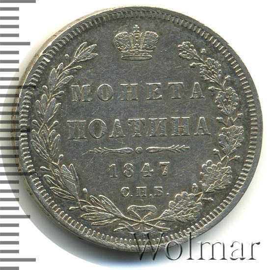 В центре указан номинал «МОНЕТА ПОЛТИНА» в две строки. Над номиналом – Корона Российской империи. Под номиналом расположен декоративный разделитель в виде двух разнонаправленных фигурных линий и небольшой окружности между ними, в центре которой, выпуклая точка. Под разделителем — дата выпуска монеты «1847». Под цифрой даты — обозначение монетного двора «С.П.Б.». Вдоль канта, не доходя до короны, изображен венок из лавровой и дубовой ветви, которые в нижней части перевязаны лентой на узел бантом. По окружности канта имеются рельефные элементы, выполненные в виде зубцов.