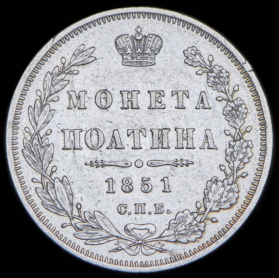 В центре указан номинал «МОНЕТА ПОЛТИНА» в две строки. Над номиналом – Корона Российской империи. Под номиналом расположен декоративный разделитель в виде двух разнонаправленных фигурных линий и небольшой окружности между ними, в центре которой, выпуклая точка. Под разделителем — дата выпуска монеты «1851». Под цифрой даты — обозначение монетного двора «С.П.Б.». Вдоль канта, не доходя до короны, изображен венок из лавровой и дубовой ветви, которые в нижней части перевязаны лентой на узел бантом. По окружности канта имеются рельефные элементы, выполненные в виде зубцов.
