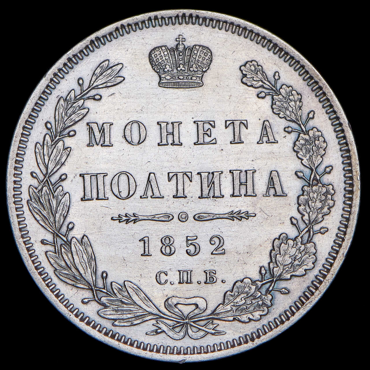 В центре указан номинал «МОНЕТА ПОЛТИНА» в две строки. Над номиналом – Корона Российской империи. Под номиналом расположен декоративный разделитель в виде двух разнонаправленных фигурных линий и небольшой окружности между ними, в центре которой, выпуклая точка. Под разделителем — дата выпуска монеты «1852». Под цифрой даты — обозначение монетного двора «С.П.Б.». Вдоль канта, не доходя до короны, изображен венок из лавровой и дубовой ветви, которые в нижней части перевязаны лентой на узел бантом. По окружности канта имеются рельефные элементы, выполненные в виде зубцов.