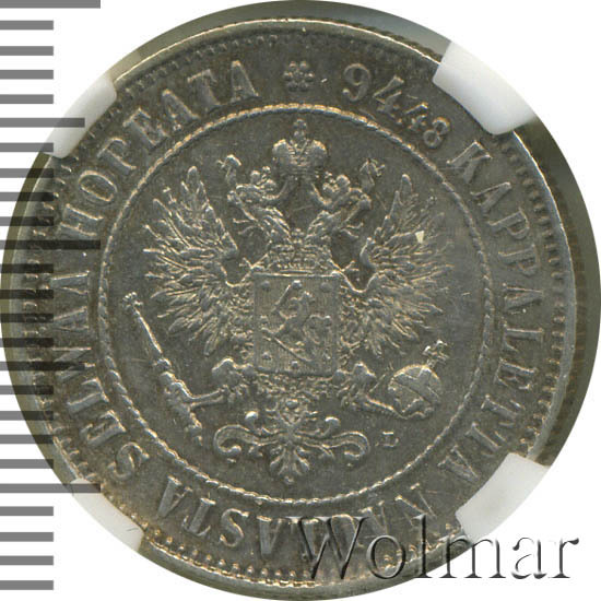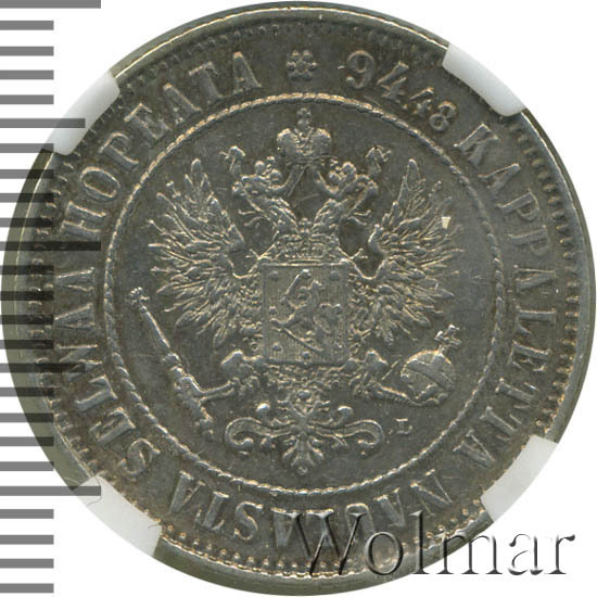 В центре изображён полный Герб Великого княжества Финляндского - двуглавый орёл, головы которого увенчаны двумя коронами, третья, большая корона над ними. Все они соединены орденской лентой ордена Св. Апостола Андрея Первозванного. На груди орла расположен щит с титульным гербом Великого князя Финляндского, увенчанный княжеской короной. Вокруг щита орденская цепь с орденом Св. Апостола Андрея Первозванного. В правой лапе орла – скипетр, в левой – держава. Под левой лапой знак директора Гельсингфосского монетного двора - литера «L», Johan Conrad Lihr (Йохан Конрад Лир). Вокруг центрального изображения - витой ободок. За ободком круговая надпись: «94.48 KAPPALETTA NAULASTA SELWÄÄ HOPEATA», сверху разделённая цветочной розеткой. По окружности канта имеются рельефные элементы, выполненные в виде зубцов.