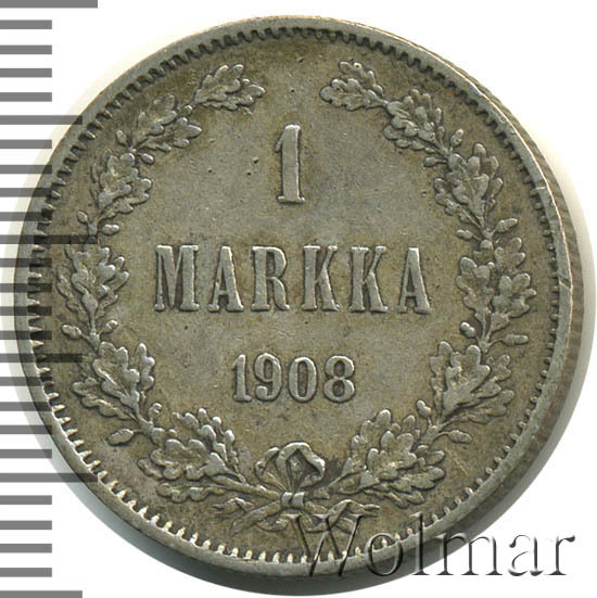В центре - надпись в три строки: «1»│«MARKAA»│«1908». Вдоль канта изображён не замкнутый венок из двух дубовых ветвей, которые, в нижней части, перевязаны лентой на узел двойным бантом. По окружности канта имеются рельефные элементы, выполненные в виде зубцов.