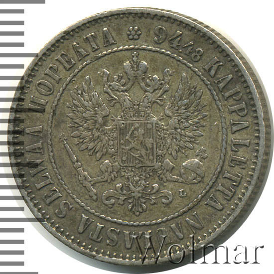 В центре изображён полный Герб Великого княжества Финляндского - двуглавый орёл, головы которого увенчаны двумя коронами, третья, большая корона над ними. Все они соединены орденской лентой ордена Св. Апостола Андрея Первозванного. На груди орла расположен щит с титульным гербом Великого князя Финляндского, увенчанный княжеской короной. Вокруг щита орденская цепь с орденом Св. Апостола Андрея Первозванного. В правой лапе орла – скипетр, в левой – держава. Под левой лапой знак директора Гельсингфосского монетного двора - литера «L», Johan Conrad Lihr (Йохан Конрад Лир). Вокруг центрального изображения - витой ободок. За ободком круговая надпись: «94.48 KAPPALETTA NAULASTA SELWÄÄ HOPEATA», сверху разделённая цветочной розеткой. По окружности канта имеются рельефные элементы, выполненные в виде зубцов.