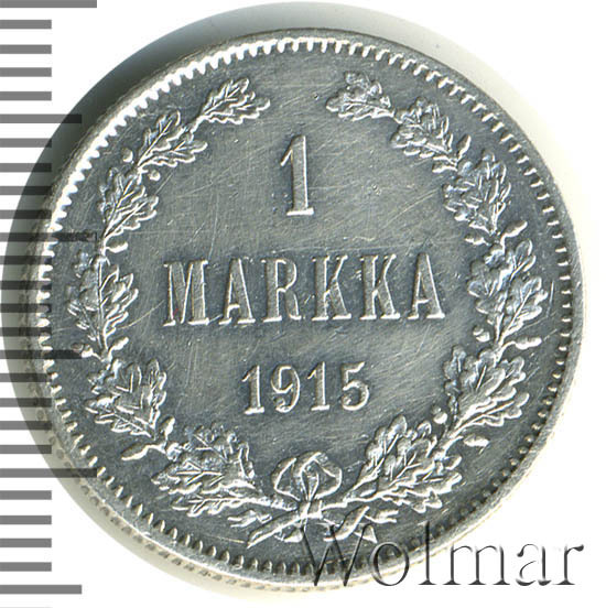 В центре - надпись в три строки: «1»│«MARKAA»│«1915». Вдоль канта изображён не замкнутый венок из двух дубовых ветвей, которые, в нижней части, перевязаны лентой на узел двойным бантом. По окружности канта имеются рельефные элементы, выполненные в виде зубцов.