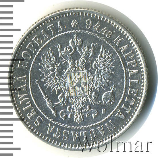 В центре изображён полный Герб Великого княжества Финляндского - двуглавый орёл, головы которого увенчаны двумя коронами, третья, большая корона над ними. Все они соединены орденской лентой ордена Св. Апостола Андрея Первозванного. На груди орла расположен щит с титульным гербом Великого князя Финляндского, увенчанный княжеской короной. Вокруг щита орденская цепь с орденом Св. Апостола Андрея Первозванного. В правой лапе орла – скипетр, в левой – держава. Под левой лапой знак директора Гельсингфосского монетного двора - литера «S», Isak Gustaf Sundell (Исаак Густаф Сундель). Вокруг центрального изображения - витой ободок. За ободком круговая надпись: «94.48 KAPPALETTA NAULASTA SELWÄÄ HOPEATA», сверху разделённая цветочной розеткой. По окружности канта имеются рельефные элементы, выполненные в виде зубцов.