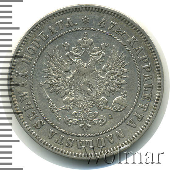 В центре изображён полный Герб Великого княжества Финляндского - двуглавый орёл, головы которого увенчаны двумя коронами, третья, большая корона над ними. Все они соединены орденской лентой ордена Св. Апостола Андрея Первозванного. На груди орла расположен щит с титульным гербом Великого князя Финляндского, увенчанный княжеской короной. Вокруг щита орденская цепь с орденом Св. Апостола Андрея Первозванного. В правой лапе орла – скипетр, в левой – держава. Под левой лапой знак директора Гельсингфосского монетного двора - литера «L» (Johan Conrad Lihr, Йохан Конрад Лир). Вокруг центрального изображения - витой ободок. За ободком круговая надпись: «47.24 KAPPALETTA NAULASTA SELWÄÄ HOPEATA», сверху разделённая цветочной розеткой. По окружности канта имеются рельефные элементы, выполненные в виде зубцов.