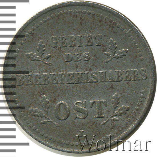 В центре надпись в четыре строки: «GEBIET»│«DES»│«OBERBEFEHLSHABERS»│«OST»(ведомство верховного главнокомандующего востока). Под надписью - литера «J», обозначение Гамбургского монетного двора. По краям надписи - четыре дубовые ветви. Третье слово в надписи разграничивает два полукруга из точек, в которые заключено центральное изображение.