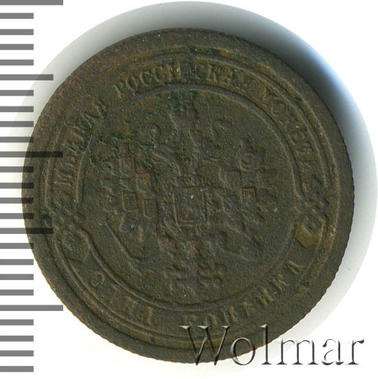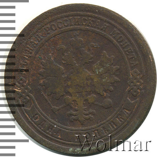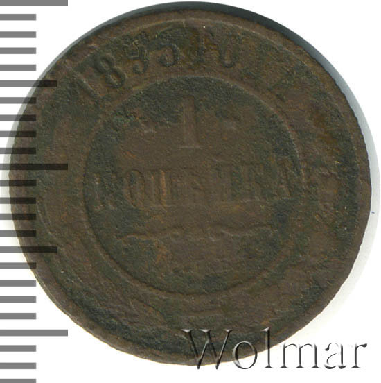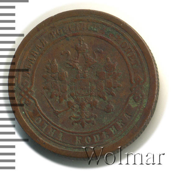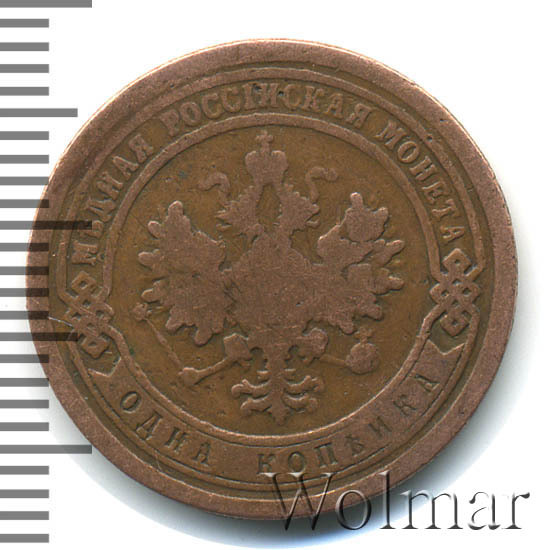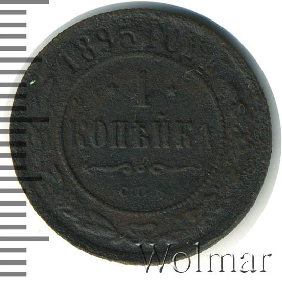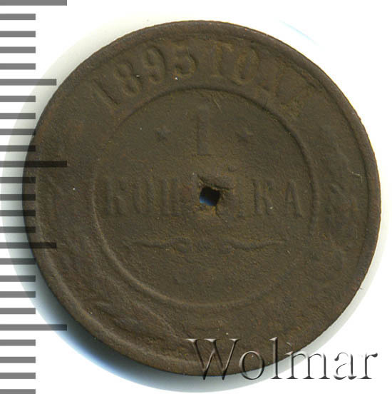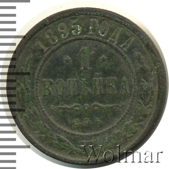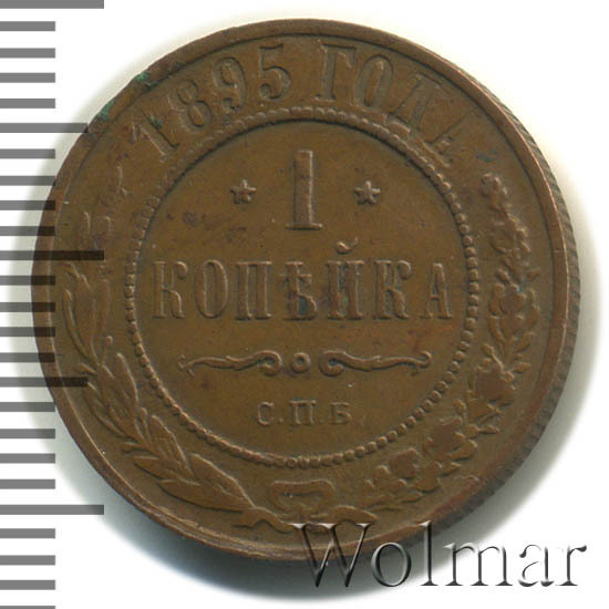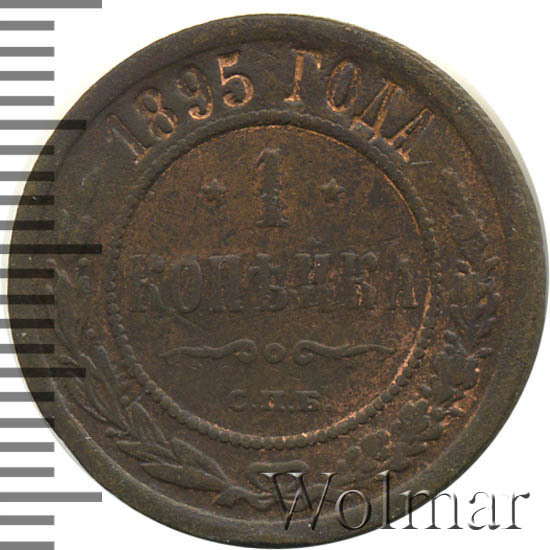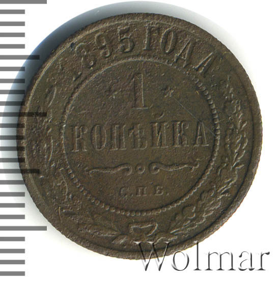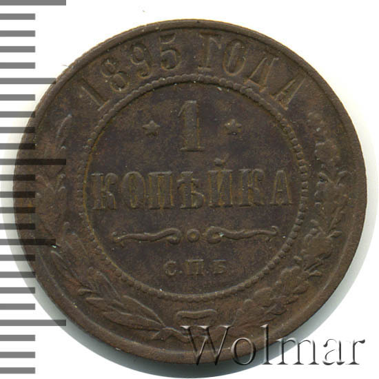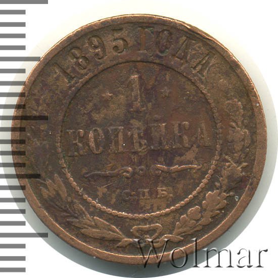 Рядовая медная монета 1 копейка 1895 года. Буквы СПБ на реверсе означают, что монета чеканилась на монетном дворе г. Санкт-Петербург. Встречается часто, тираж большой. В превосходной сохранности такая монета наиболее ценная, за исключением экземпляров Пруф-чеканки.