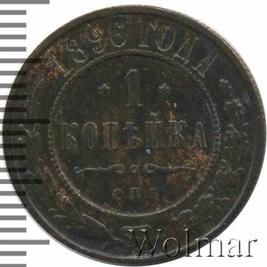 В центре указан номинал — цифра «1», ограниченная с обеих сторон звездочками. Под цифрой номинала — слово "КОПЕЙКА". Ниже, расположен декоративный разделитель в виде двух изогнутых линий и небольшой окружности между ними. Под разделителем — обозначение монетного двора «С.П.Б.». Центральная часть отделена от остального изображения, окружностью в виде точек. В верхней части полукругом углубленная надпись: "1896 ГОДА". Ниже этой надписи, вдоль канта, изображен венок из лавровой и дубовой ветвей, которые, в нижней части, перевязаны лентой на узел бантом.