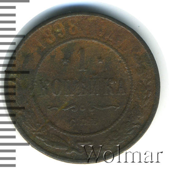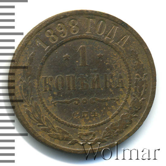 В центре указан номинал — цифра «1», ограниченная с обеих сторон звездочками. Под цифрой номинала — слово "КОПЕЙКА". Ниже, расположен декоративный разделитель в виде двух изогнутых линий и небольшой окружности между ними. Под разделителем — обозначение монетного двора «С.П.Б.». Центральная часть отделена от остального изображения, окружностью в виде точек. В верхней части полукругом углубленная надпись: "1898 ГОДА". Ниже этой надписи, вдоль канта, изображен венок из лавровой и дубовой ветвей, которые, в нижней части, перевязаны лентой на узел бантом.