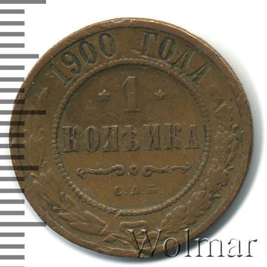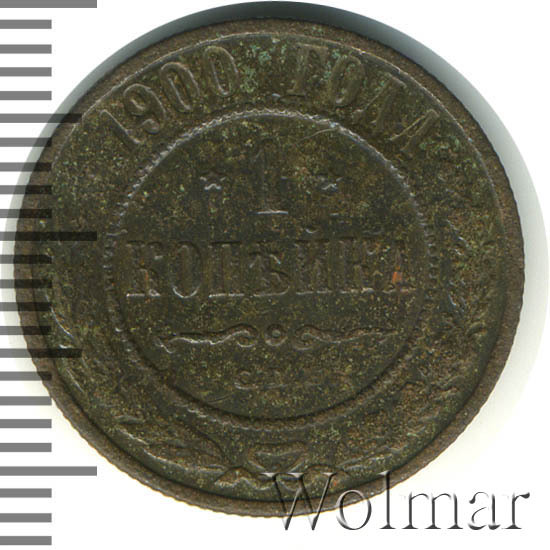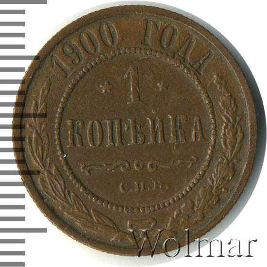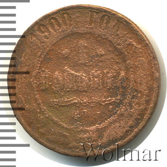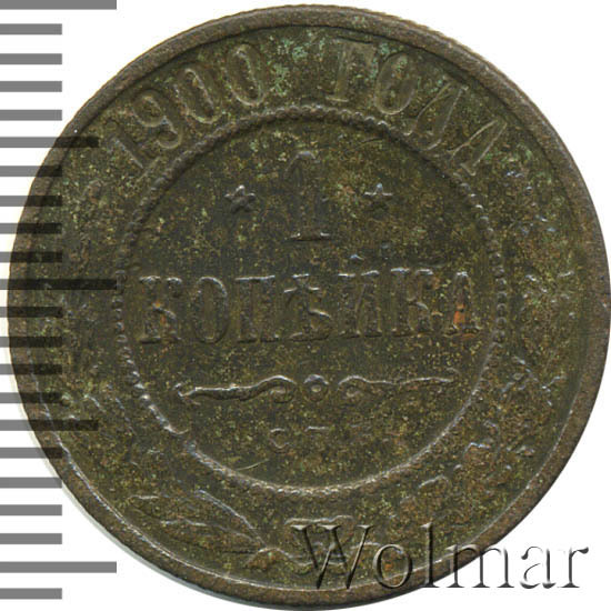 В центре указан номинал — цифра «1», ограниченная с обеих сторон звездочками. Под цифрой номинала — слово "КОПЕЙКА". Ниже, расположен декоративный разделитель в виде двух изогнутых линий и небольшой окружности между ними. Под разделителем — обозначение монетного двора «С.П.Б.». Центральная часть отделена от остального изображения, окружностью в виде точек. В верхней части полукругом углубленная надпись: "1900 ГОДА". Ниже этой надписи, вдоль канта, изображен венок из лавровой и дубовой ветвей, которые, в нижней части, перевязаны лентой на узел бантом.