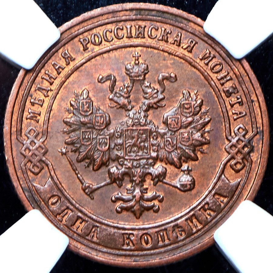 В центре монеты изображен Малый Государственный Герб Российской империи - двуглавый орел, головы которого увенчаны двумя коронами, третья, большая корона над ними. Все они соединены лентой Андрея Первозванного. В правой лапе орла – скипетр, в левой – держава. На его груди расположен Московский герб, в щите изображен Георгий Победоносец с копьем поражающий дракона. Вокруг щита цепь ордена Св. Апостола Андрея Первозванного. На крыльях орла изображены гербы: Царства Казанского, Польского, Херсонеса Таврического, Астраханского, Сибирского, Грузинского и герб соединенных княжеств Киевского, Новгородского и Владимирского — по 4 на каждое крыло. По окружности - две полукруглые плашки, соединенные узорами. На верхней плашке выпуклая надпись: "МЕДНАЯ РОССИЙСКАЯ МОНЕТА". На нижней плашке, изображенной в виде ленты, углубленная надпись: "ОДНА КОПЕЙКА".