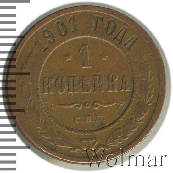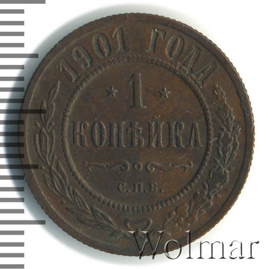 В центре указан номинал — цифра «1», ограниченная с обеих сторон звездочками. Под цифрой номинала — слово "КОПЕЙКА". Ниже, расположен декоративный разделитель в виде двух изогнутых линий и небольшой окружности между ними. Под разделителем — обозначение монетного двора «С.П.Б.». Центральная часть отделена от остального изображения, окружностью в виде точек. В верхней части полукругом углубленная надпись: "1901 ГОДА". Ниже этой надписи, вдоль канта, изображен венок из лавровой и дубовой ветвей, которые, в нижней части, перевязаны лентой на узел бантом.