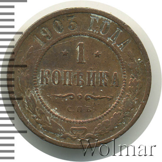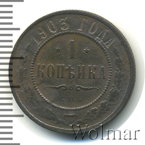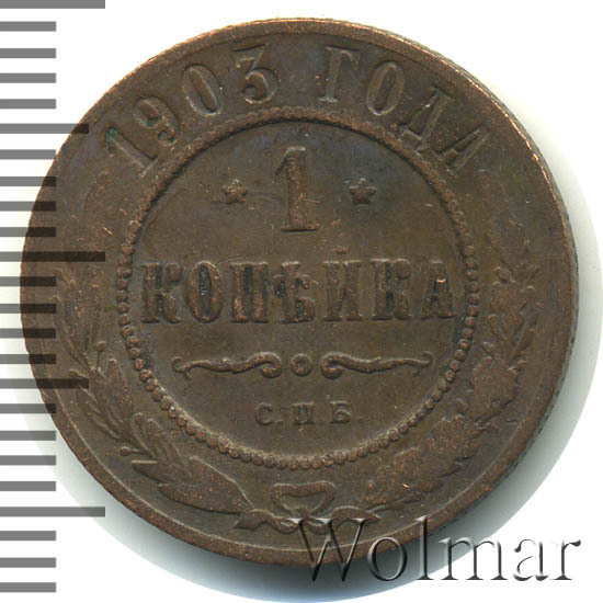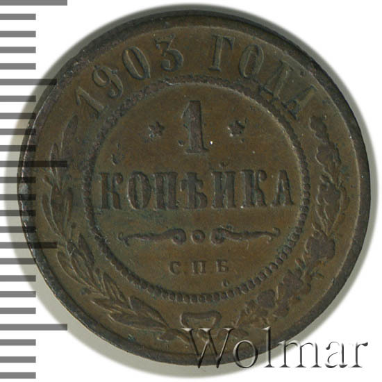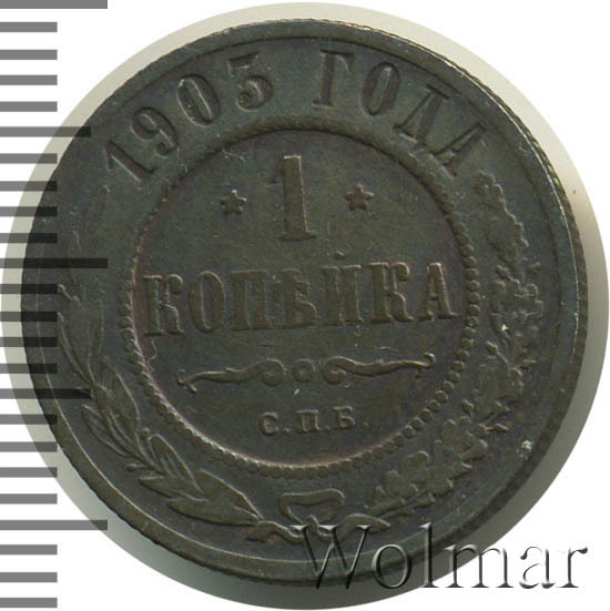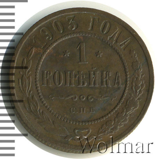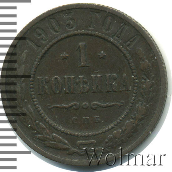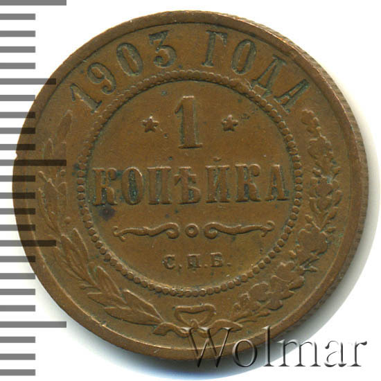 В центре указан номинал — цифра «1», ограниченная с обеих сторон звездочками. Под цифрой номинала — слово "КОПЕЙКА". Ниже, расположен декоративный разделитель в виде двух изогнутых линий и небольшой окружности между ними. Под разделителем — обозначение монетного двора «С.П.Б.». Центральная часть отделена от остального изображения, окружностью в виде точек. В верхней части полукругом углубленная надпись: "1903 ГОДА". Ниже этой надписи, вдоль канта, изображен венок из лавровой и дубовой ветвей, которые, в нижней части, перевязаны лентой на узел бантом.