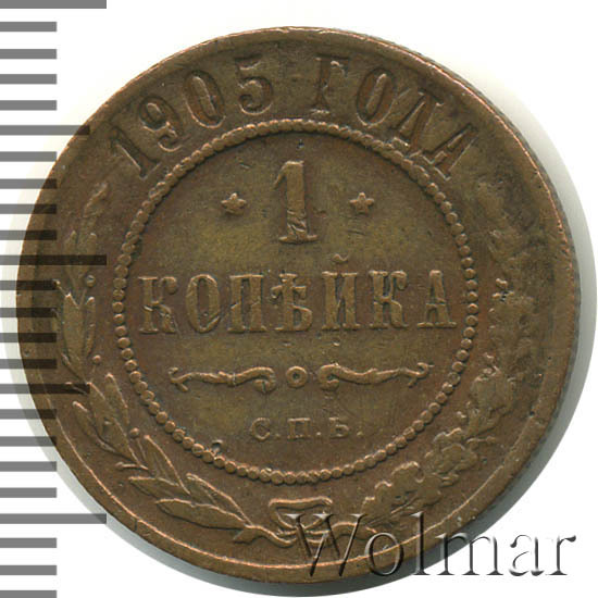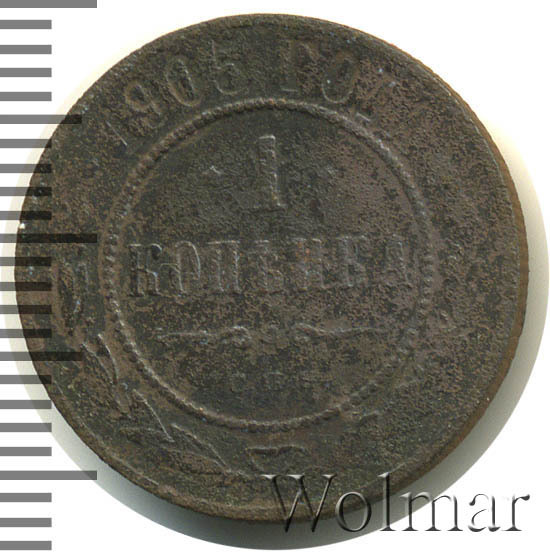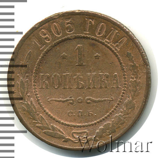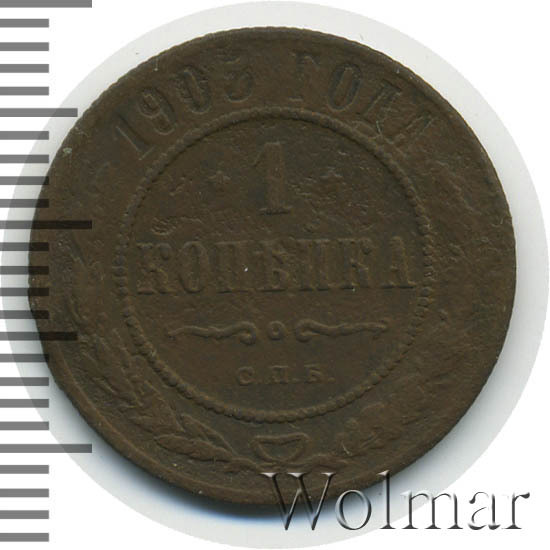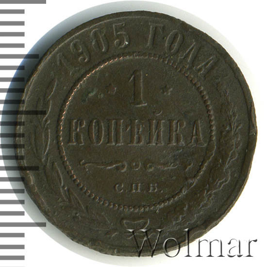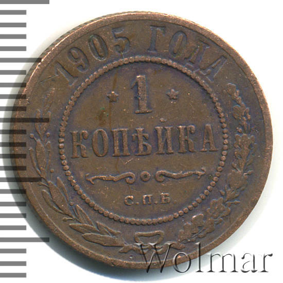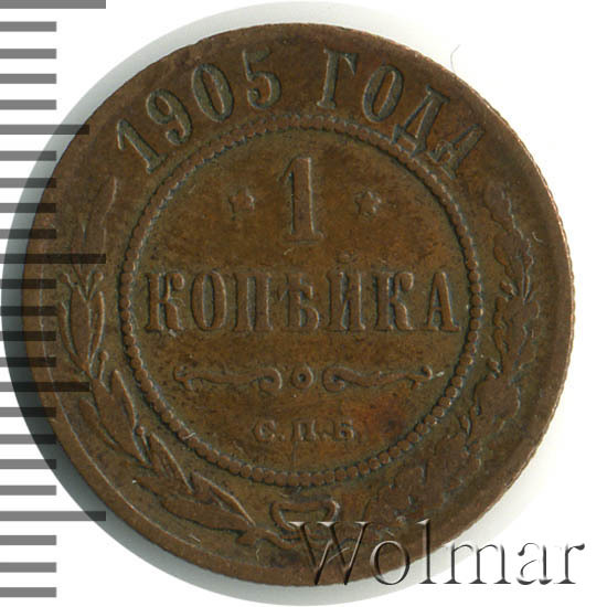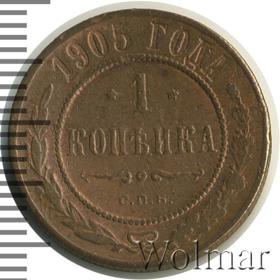 В центре указан номинал — цифра «1», ограниченная с обеих сторон звездочками. Под цифрой номинала — слово "КОПЕЙКА". Ниже, расположен декоративный разделитель в виде двух изогнутых линий и небольшой окружности между ними. Под разделителем — обозначение монетного двора «С.П.Б.». Центральная часть отделена от остального изображения, окружностью в виде точек. В верхней части полукругом углубленная надпись: "1905 ГОДА". Ниже этой надписи, вдоль канта, изображен венок из лавровой и дубовой ветвей, которые, в нижней части, перевязаны лентой на узел бантом.