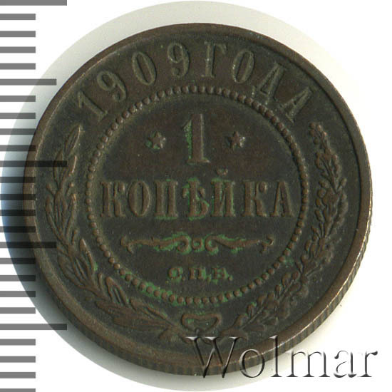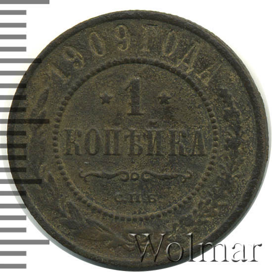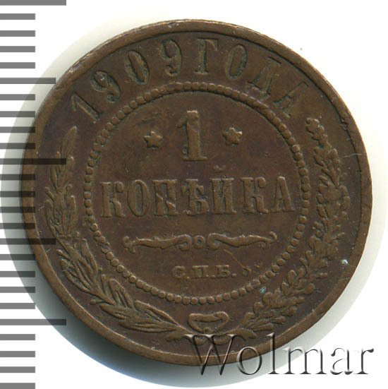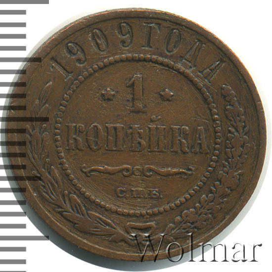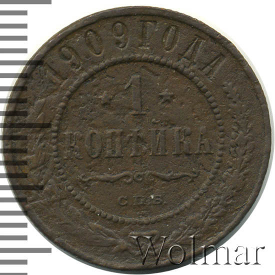 В центре указан номинал — цифра «1», ограниченная с обеих сторон звездочками. Под цифрой номинала — слово "КОПЕЙКА". Ниже, расположен декоративный разделитель в виде двух изогнутых линий и небольшой окружности между ними. Под разделителем — обозначение монетного двора «С.П.Б.». Центральная часть отделена от остального изображения, окружностью в виде точек. В верхней части полукругом углубленная надпись: "1909 ГОДА". Ниже этой надписи, вдоль канта, изображен венок из лавровой и дубовой ветвей, которые, в нижней части, перевязаны лентой на узел бантом.