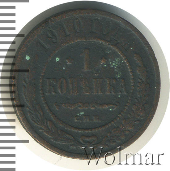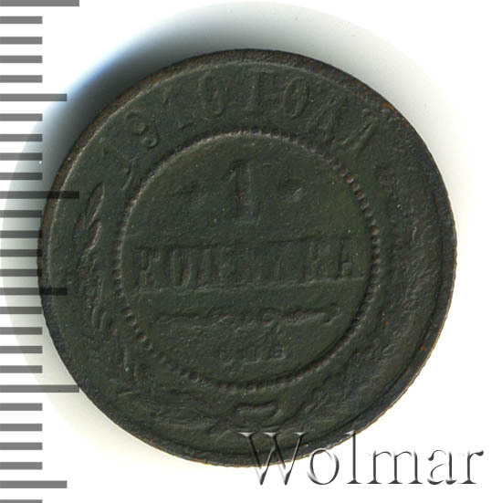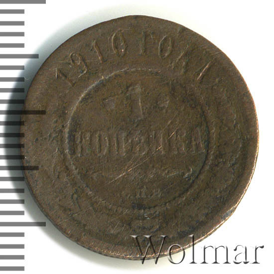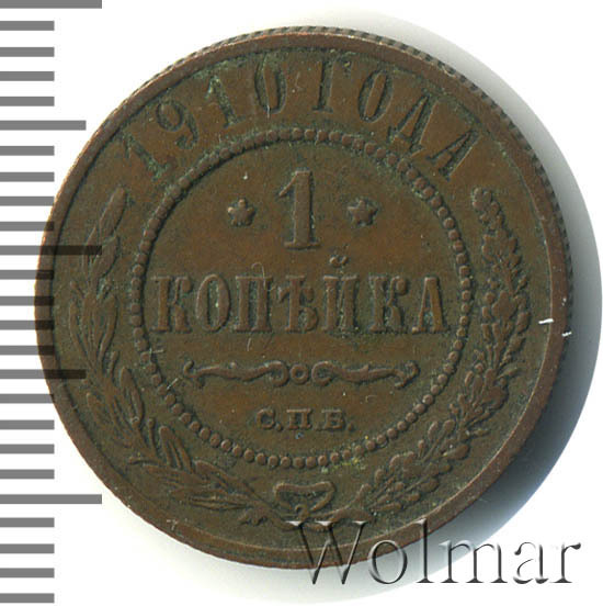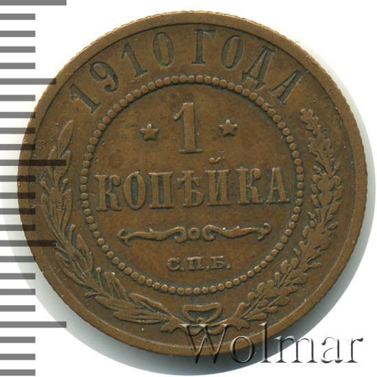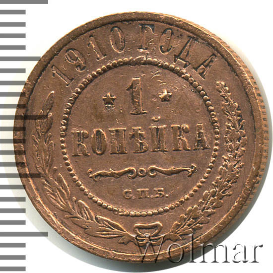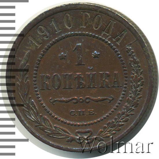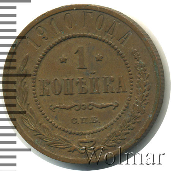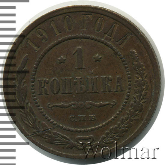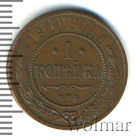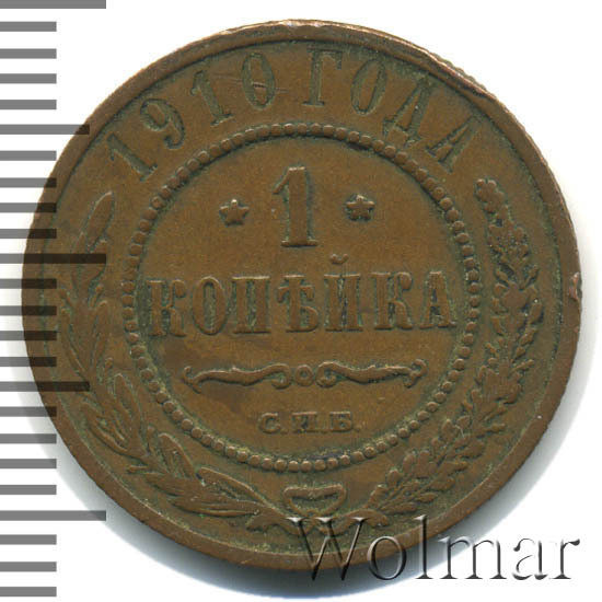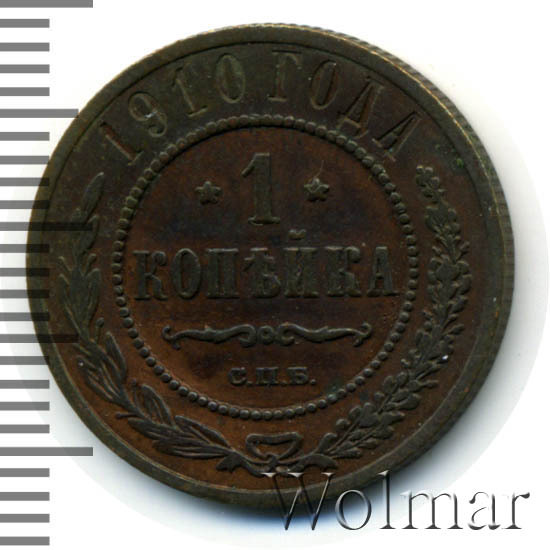 В центре указан номинал — цифра «1», ограниченная с обеих сторон звездочками. Под цифрой номинала — слово "КОПЕЙКА". Ниже, расположен декоративный разделитель в виде двух изогнутых линий и небольшой окружности между ними. Под разделителем — обозначение монетного двора «С.П.Б.». Центральная часть отделена от остального изображения, окружностью в виде точек. В верхней части полукругом углубленная надпись: "1910 ГОДА". Ниже этой надписи, вдоль канта, изображен венок из лавровой и дубовой ветвей, которые, в нижней части, перевязаны лентой на узел бантом.