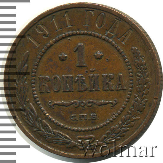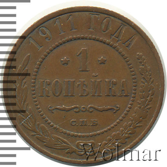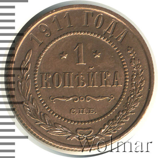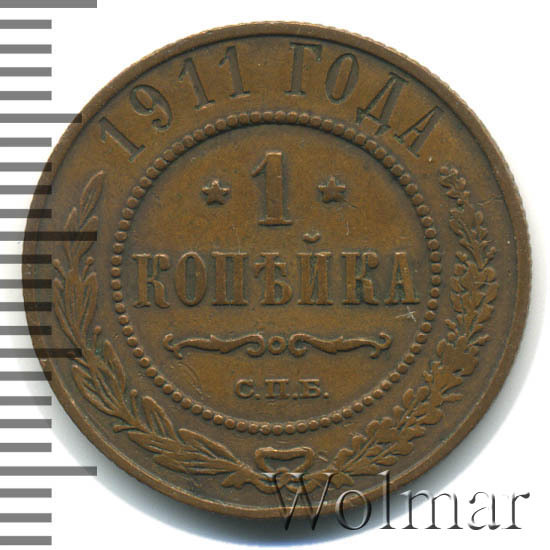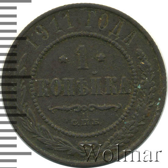 В центре указан номинал — цифра «1», ограниченная с обеих сторон звездочками. Под цифрой номинала — слово "КОПЕЙКА". Ниже, расположен декоративный разделитель в виде двух изогнутых линий и небольшой окружности между ними. Под разделителем — обозначение монетного двора «С.П.Б.». Центральная часть отделена от остального изображения, окружностью в виде точек. В верхней части полукругом углубленная надпись: "1911 ГОДА". Ниже этой надписи, вдоль канта, изображен венок из лавровой и дубовой ветвей, которые, в нижней части, перевязаны лентой на узел бантом.