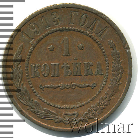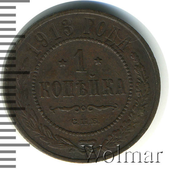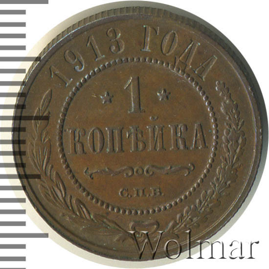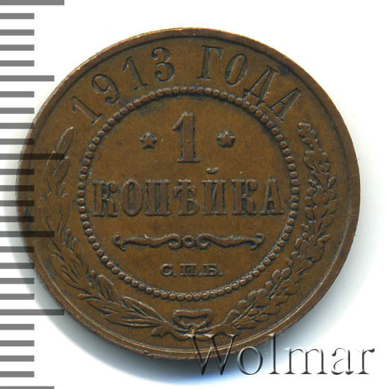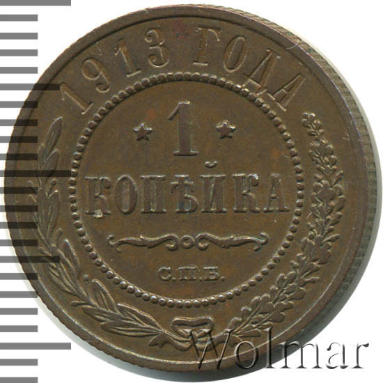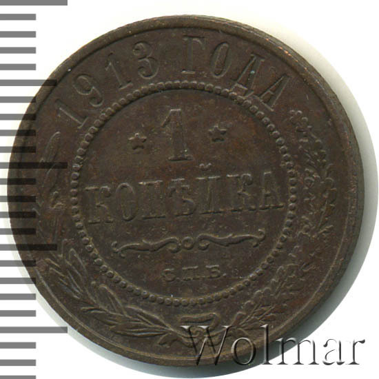 В центре указан номинал — цифра «1», ограниченная с обеих сторон звездочками. Под цифрой номинала — слово "КОПЕЙКА". Ниже, расположен декоративный разделитель в виде двух изогнутых линий и небольшой окружности между ними. Под разделителем — обозначение монетного двора «С.П.Б.». Центральная часть отделена от остального изображения, окружностью в виде точек. В верхней части полукругом углубленная надпись: "1913 ГОДА". Ниже этой надписи, вдоль канта, изображен венок из лавровой и дубовой ветвей, которые, в нижней части, перевязаны лентой на узел бантом.