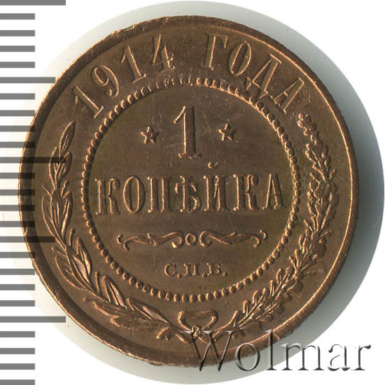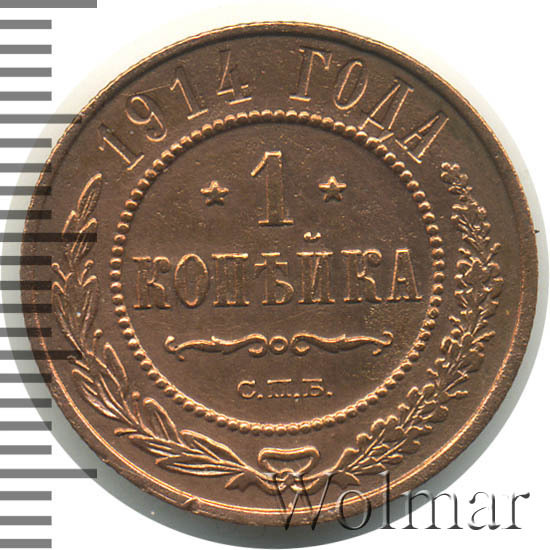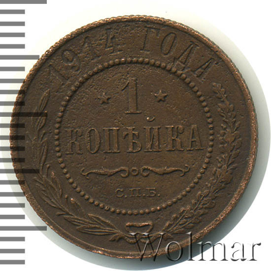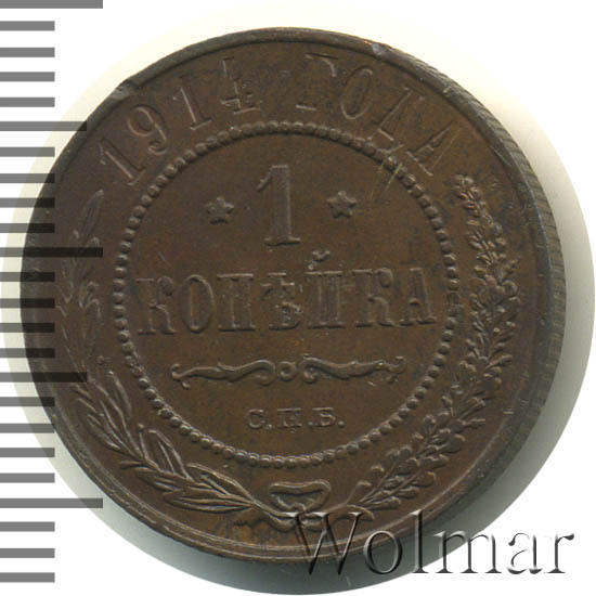 В центре указан номинал — цифра «1», ограниченная с обеих сторон звездочками. Под цифрой номинала — слово "КОПЕЙКА". Ниже, расположен декоративный разделитель в виде двух изогнутых линий и небольшой окружности между ними. Под разделителем — обозначение монетного двора «С.П.Б.». Центральная часть отделена от остального изображения, окружностью в виде точек. В верхней части полукругом углубленная надпись: "1914 ГОДА". Ниже этой надписи, вдоль канта, изображен венок из лавровой и дубовой ветвей, которые, в нижней части, перевязаны лентой на узел бантом.