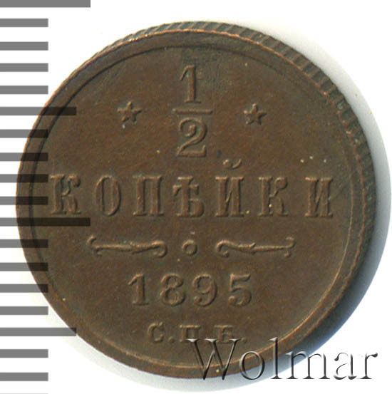 В центре указан номинал «1/2», ограниченный с обеих сторон звездочками. Под цифрой номинала слово — "КОПЕЙКИ". Ниже, расположен декоративный разделитель в виде двух изогнутых линий и небольшой окружности между ними. Под линиями год выпуска монеты "1895" и под ним обозначение монетного двора «С.П.Б.».