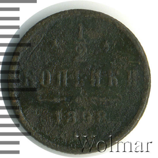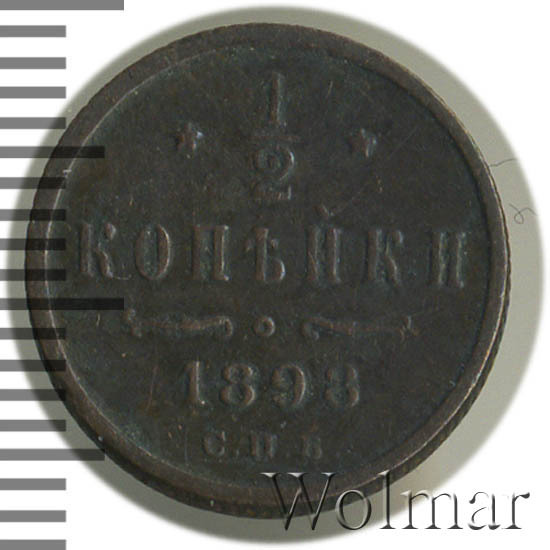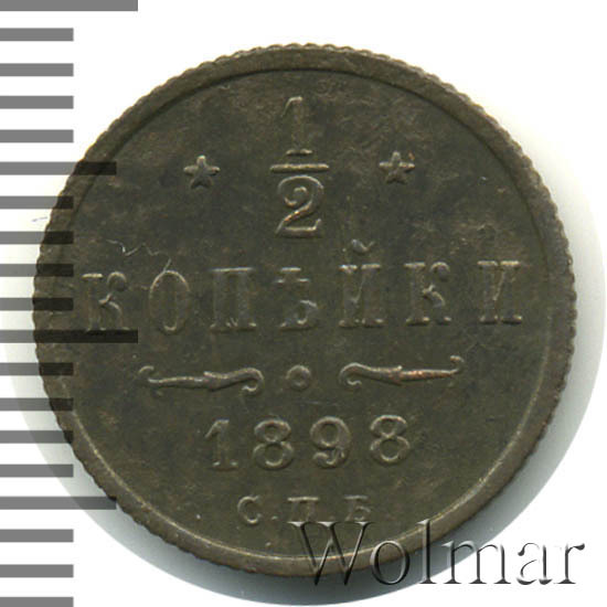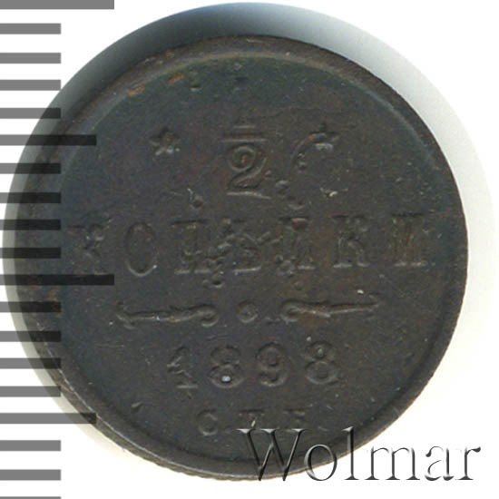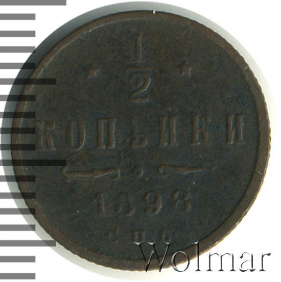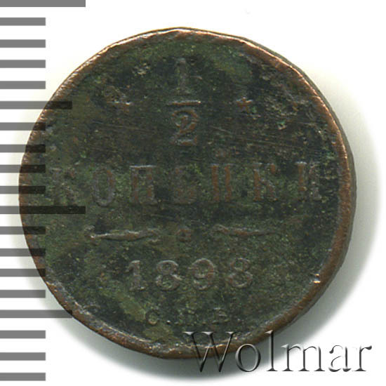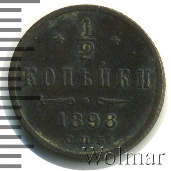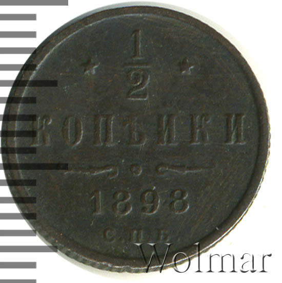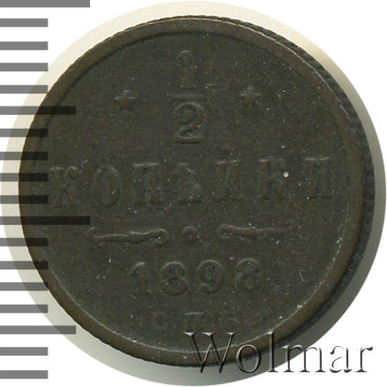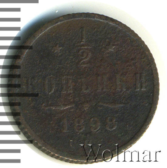 В центре указан номинал «1/2», ограниченный с обеих сторон звездочками. Под цифрой номинала слово — "КОПЕЙКИ". Ниже, расположен декоративный разделитель в виде двух изогнутых линий и небольшой окружности между ними. Под линиями год выпуска монеты "1898" и под ним обозначение монетного двора «С.П.Б.».