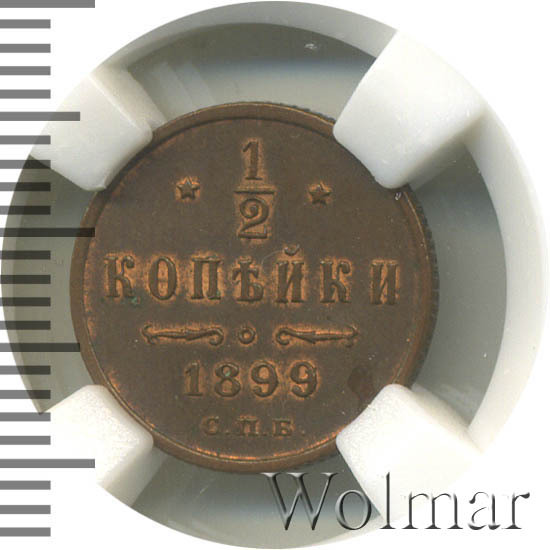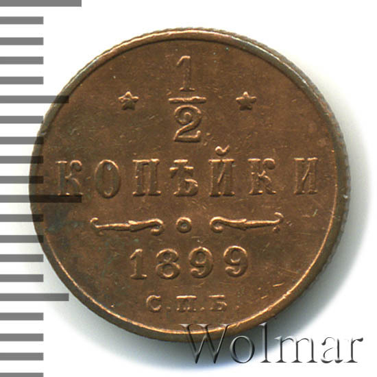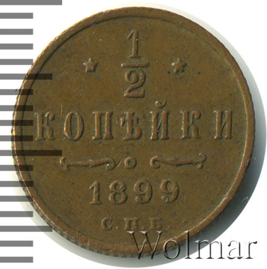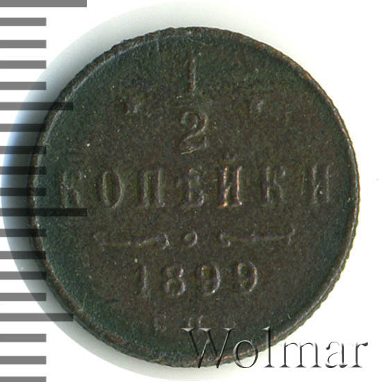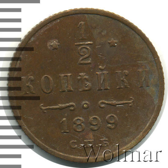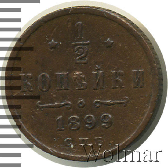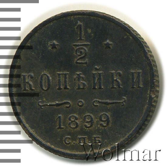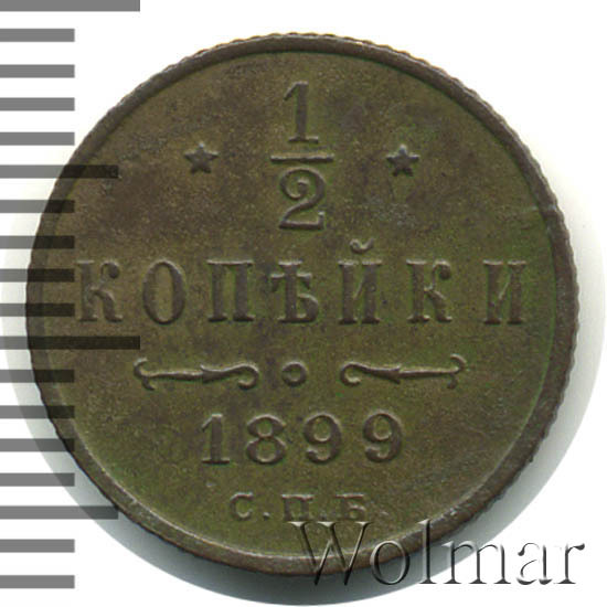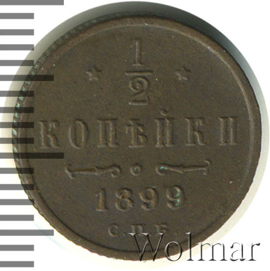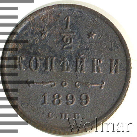 В центре указан номинал «1/2», ограниченный с обеих сторон звездочками. Под цифрой номинала слово — "КОПЕЙКИ". Ниже, расположен декоративный разделитель в виде двух изогнутых линий и небольшой окружности между ними. Под линиями год выпуска монеты "1899" и под ним обозначение монетного двора «С.П.Б.».