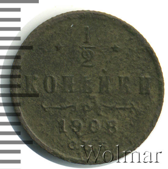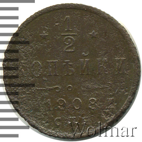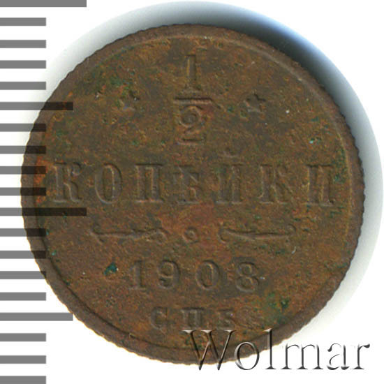 В центре указан номинал «1/2», ограниченный с обеих сторон звездочками. Под цифрой номинала слово — "КОПЕЙКИ". Ниже, расположен декоративный разделитель в виде двух изогнутых линий и небольшой окружности между ними. Под линиями год выпуска монеты "1908" и под ним обозначение монетного двора «С.П.Б.».