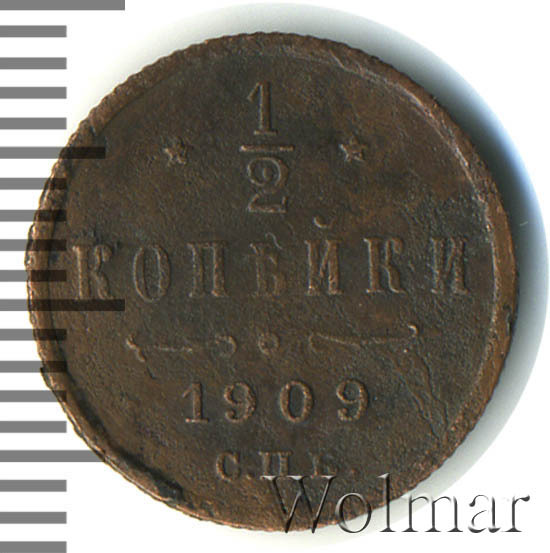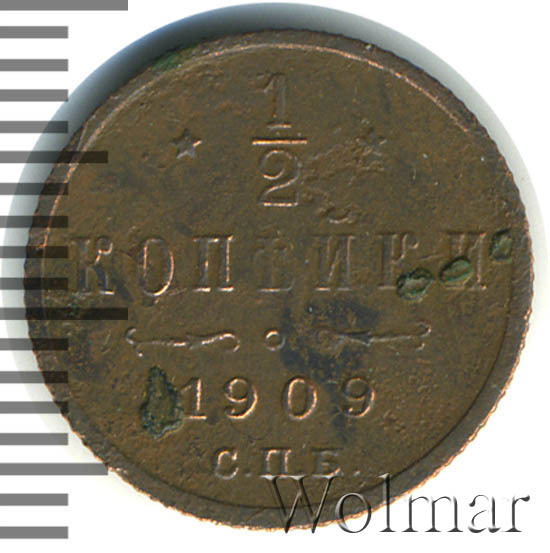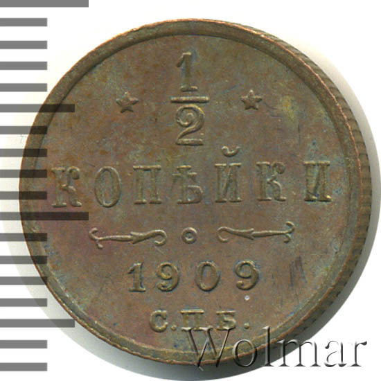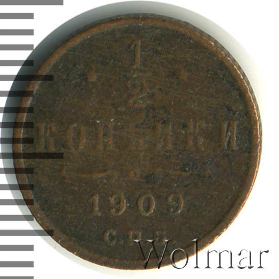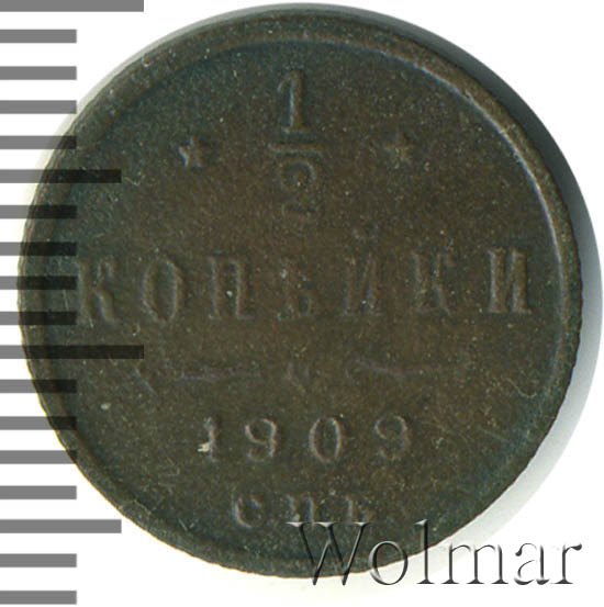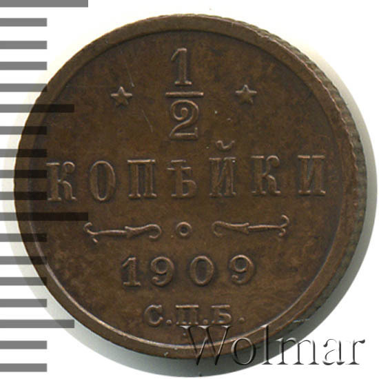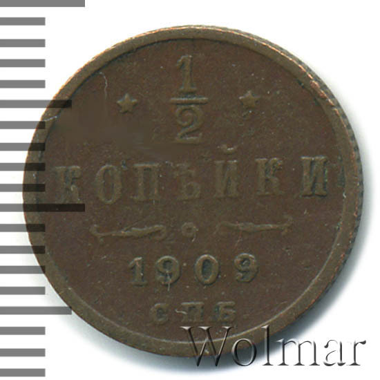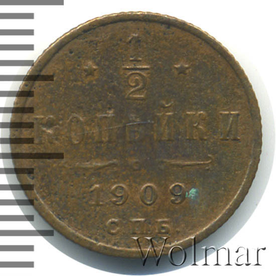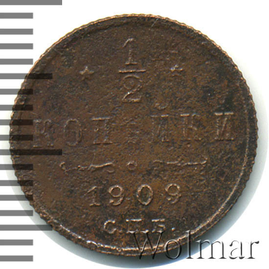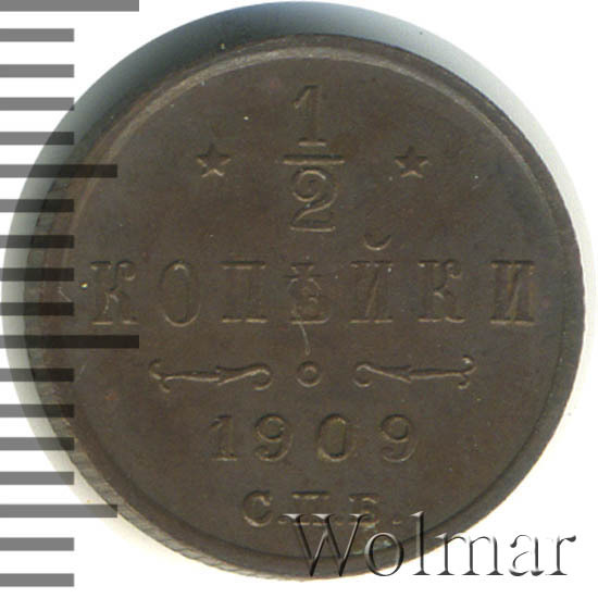 В центре указан номинал «1/2», ограниченный с обеих сторон звездочками. Под цифрой номинала слово — "КОПЕЙКИ". Ниже, расположен декоративный разделитель в виде двух изогнутых линий и небольшой окружности между ними. Под линиями год выпуска монеты "1909" и под ним обозначение монетного двора «С.П.Б.».