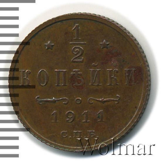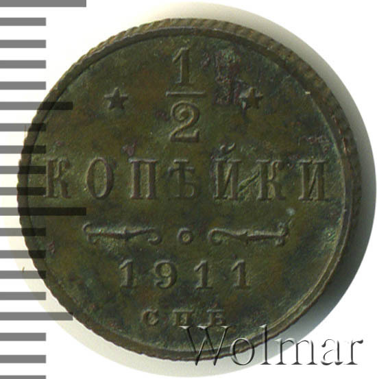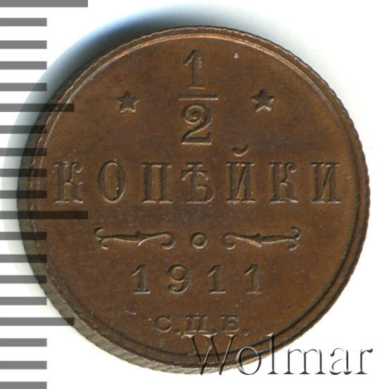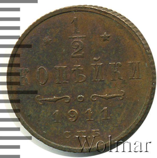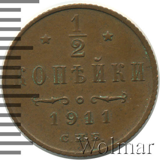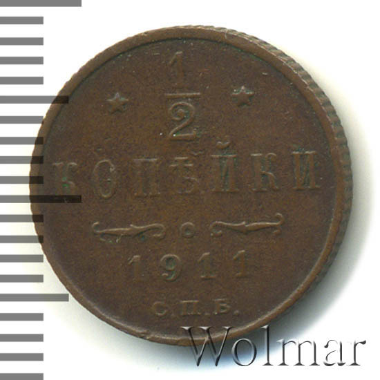 В центре указан номинал «1/2», ограниченный с обеих сторон звездочками. Под цифрой номинала слово — "КОПЕЙКИ". Ниже, расположен декоративный разделитель в виде двух изогнутых линий и небольшой окружности между ними. Под линиями год выпуска монеты "1911" и под ним обозначение монетного двора «С.П.Б.».