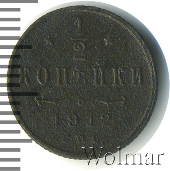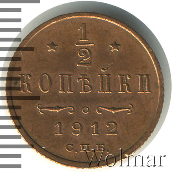 В центре указан номинал «1/2», ограниченный с обеих сторон звездочками. Под цифрой номинала слово — "КОПЕЙКИ". Ниже, расположен декоративный разделитель в виде двух изогнутых линий и небольшой окружности между ними. Под линиями год выпуска монеты "1912" и под ним обозначение монетного двора «С.П.Б.».