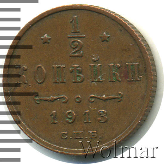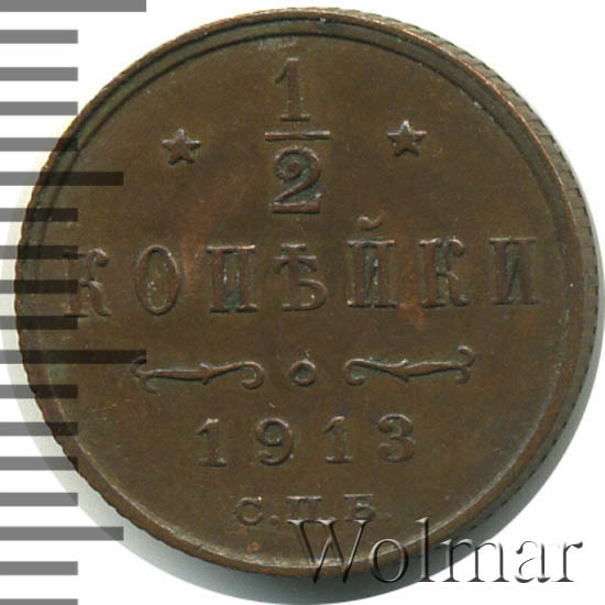 В центре указан номинал «1/2», ограниченный с обеих сторон звездочками. Под цифрой номинала слово — "КОПЕЙКИ". Ниже, расположен декоративный разделитель в виде двух изогнутых линий и небольшой окружности между ними. Под линиями год выпуска монеты "1913" и под ним обозначение монетного двора «С.П.Б.».