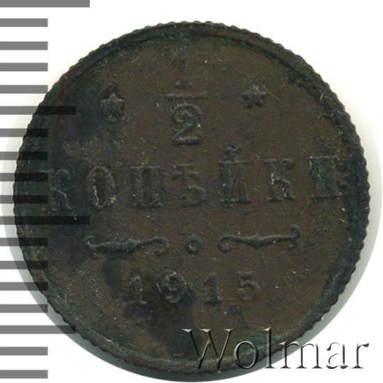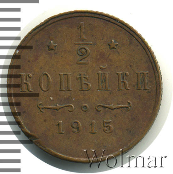 В центре указан номинал «1/2», ограниченный с обеих сторон звездочками. Под цифрой номинала слово — "КОПЕЙКИ". Ниже, расположен декоративный разделитель в виде двух изогнутых линий и небольшой окружности между ними. Под линиями год выпуска монеты "1915".