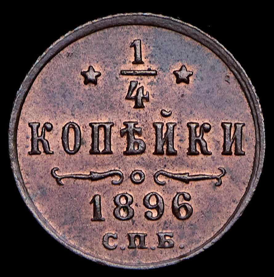 В центре указан номинал «1/4», ограниченный с обеих сторон звездочками. Под цифрой номинала слово — "КОПЕЙКИ". Ниже, расположен декоративный разделитель в виде двух изогнутых линий и небольшой окружности между ними. Под линиями год выпуска монеты "1896" и под ним обозначение монетного двора «С.П.Б.».