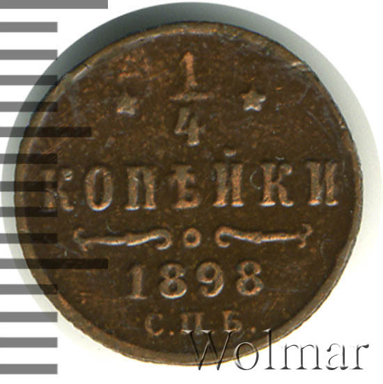 В центре указан номинал «1/4», ограниченный с обеих сторон звездочками. Под цифрой номинала слово — "КОПЕЙКИ". Ниже, расположен декоративный разделитель в виде двух изогнутых линий и небольшой окружности между ними. Под линиями год выпуска монеты "1898" и под ним обозначение монетного двора «С.П.Б.».