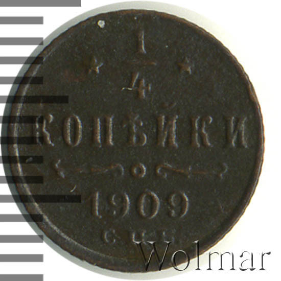 В центре указан номинал «1/4», ограниченный с обеих сторон звездочками. Под цифрой номинала слово — "КОПЕЙКИ". Ниже, расположен декоративный разделитель в виде двух изогнутых линий и небольшой окружности между ними. Под линиями год выпуска монеты "1909" и под ним обозначение монетного двора «С.П.Б.».