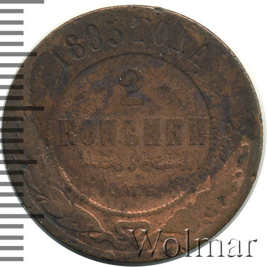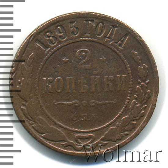 В центре указан номинал — цифра «2», ограниченная с обеих сторон звездочками. Под цифрой номинала — слово "КОПЕЙКИ". Ниже, расположен декоративный разделитель в виде двух изогнутых линий и небольшой окружности между ними. Под разделителем — обозначение монетного двора «С.П.Б.». Центральная часть отделена от остального изображения, окружностью в виде точек. В верхней части полукругом углубленная надпись: "1895 ГОДА". Ниже этой надписи, вдоль канта, изображен венок из лавровой и дубовой ветвей, которые, в нижней части, перевязаны лентой на узел бантом.