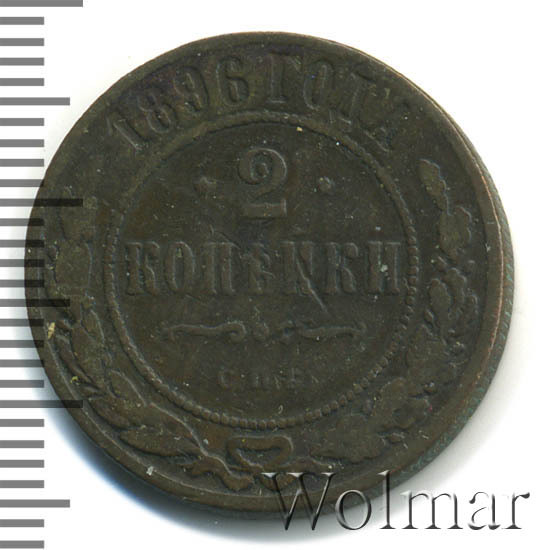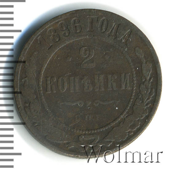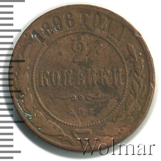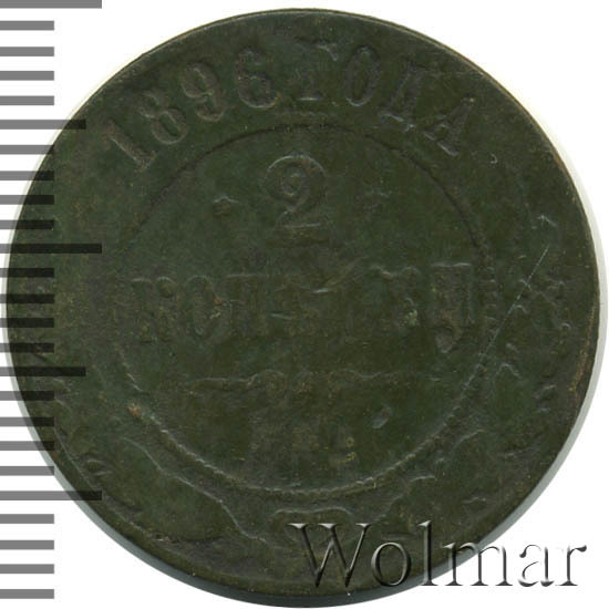 В центре указан номинал — цифра «2», ограниченная с обеих сторон звездочками. Под цифрой номинала — слово "КОПЕЙКИ". Ниже, расположен декоративный разделитель в виде двух изогнутых линий и небольшой окружности между ними. Под разделителем — обозначение монетного двора «С.П.Б.». Центральная часть отделена от остального изображения, окружностью в виде точек. В верхней части полукругом углубленная надпись: "1896 ГОДА". Ниже этой надписи, вдоль канта, изображен венок из лавровой и дубовой ветвей, которые, в нижней части, перевязаны лентой на узел бантом.
