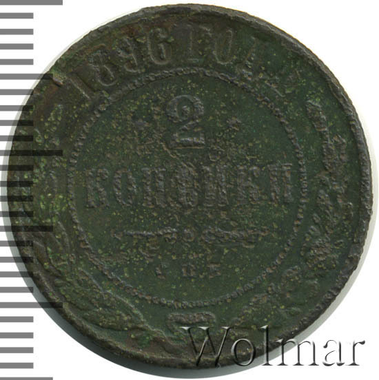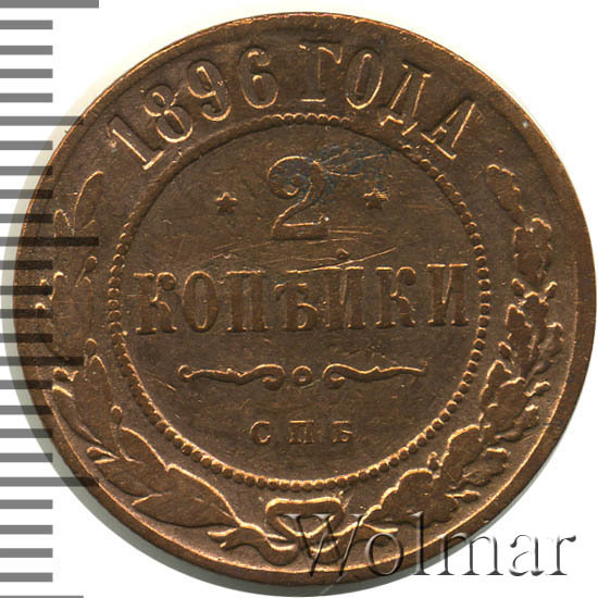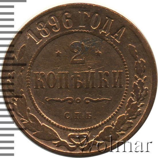 2 копейки 1896 года. Начиная с этого года и до 1898 года все медный монеты,кроме 5-копеечных чеканились в Великобретании на Бирменгемском монетном дворе. При этом, на монетах имеется обозначение СПБ, что не говорит о том, что чеканка производилась в Санкт-Петербурге. Цена монеты 2 копейки 1896 СПБ невелика вследствиетого что монета встречается часто из-за огромного тиража - 20 млн штук. Исключение составляют монеты в исключительной сохранности и монеты качества Proof.