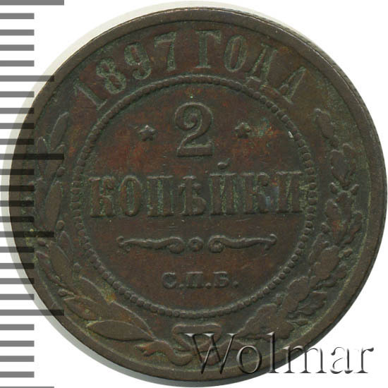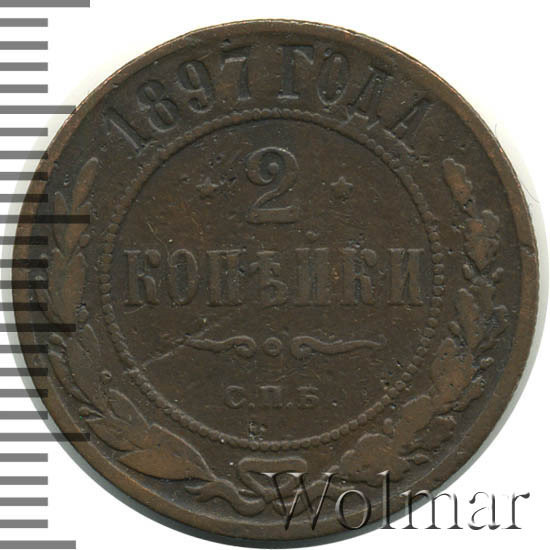 В центре указан номинал — цифра «2», ограниченная с обеих сторон звездочками. Под цифрой номинала — слово "КОПЕЙКИ". Ниже, расположен декоративный разделитель в виде двух изогнутых линий и небольшой окружности между ними. Под разделителем — обозначение монетного двора «С.П.Б.». Центральная часть отделена от остального изображения, окружностью в виде точек. В верхней части полукругом углубленная надпись: "1897 ГОДА". Ниже этой надписи, вдоль канта, изображен венок из лавровой и дубовой ветвей, которые, в нижней части, перевязаны лентой на узел бантом.