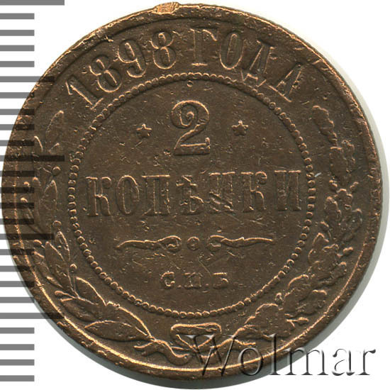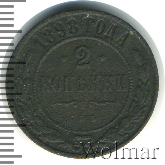 В центре указан номинал — цифра «2», ограниченная с обеих сторон звездочками. Под цифрой номинала — слово "КОПЕЙКИ". Ниже, расположен декоративный разделитель в виде двух изогнутых линий и небольшой окружности между ними. Под разделителем — обозначение монетного двора «С.П.Б.». Центральная часть отделена от остального изображения, окружностью в виде точек. В верхней части полукругом углубленная надпись: "1898 ГОДА". Ниже этой надписи, вдоль канта, изображен венок из лавровой и дубовой ветвей, которые, в нижней части, перевязаны лентой на узел бантом.