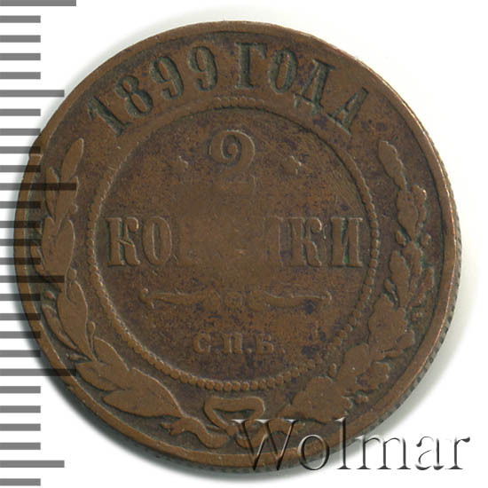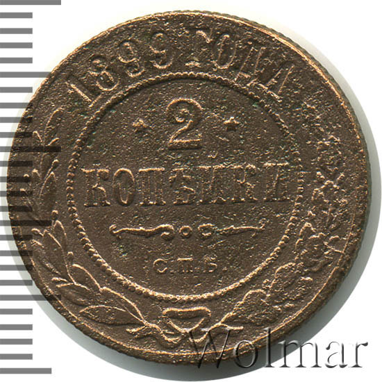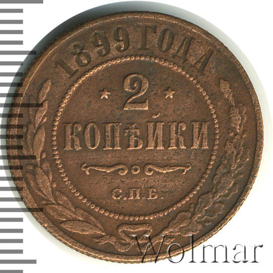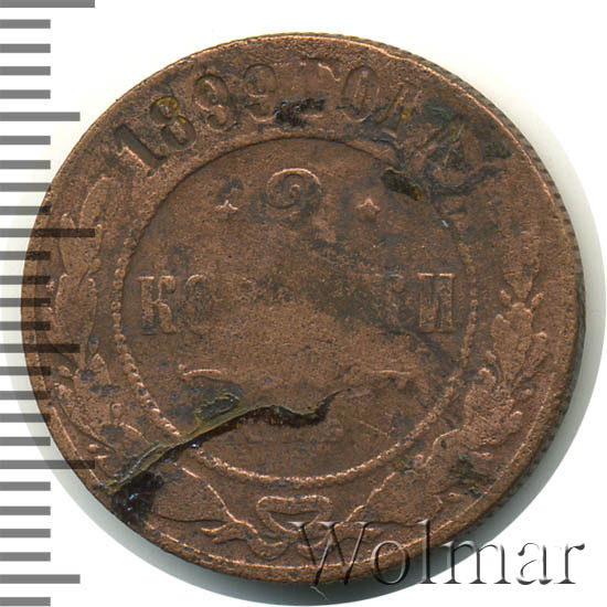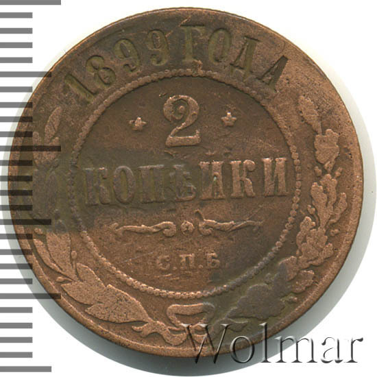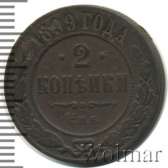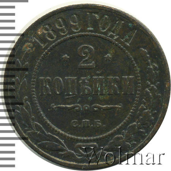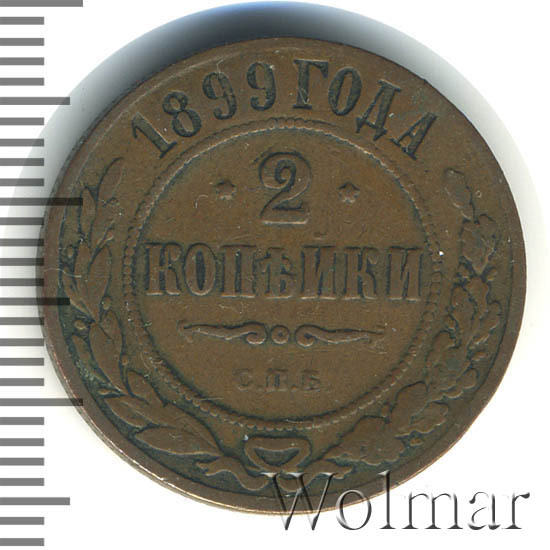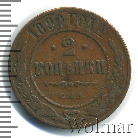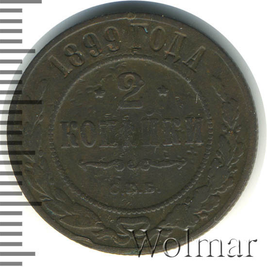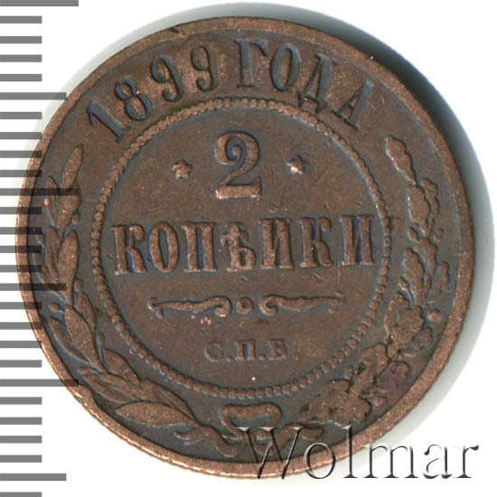 В центре указан номинал — цифра «2», ограниченная с обеих сторон звездочками. Под цифрой номинала — слово "КОПЕЙКИ". Ниже, расположен декоративный разделитель в виде двух изогнутых линий и небольшой окружности между ними. Под разделителем — обозначение монетного двора «С.П.Б.». Центральная часть отделена от остального изображения, окружностью в виде точек. В верхней части полукругом углубленная надпись: "1899 ГОДА". Ниже этой надписи, вдоль канта, изображен венок из лавровой и дубовой ветвей, которые, в нижней части, перевязаны лентой на узел бантом.