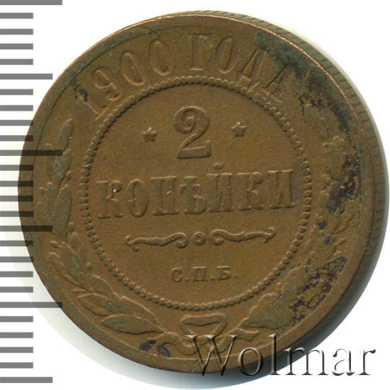 2 копейки 1900 года СПБ - рядовая монета регулярного чекана времен царствования Николая II, которая чеканилась монета на заводе Розенкранца в г. Санкт-Петербург огромным тиражом., вследствие чего цена ее небольшая. Исключение могут составлять монеты в превосходной сохранности, стоимость которых вполне пhиличная. Кроме того, стоит отметить существование монет 2 копейки 1900 года СПБ, отчеканенных качества чеканки Proof, цена которых во много раз выше цены аналогичных монет регулярного чекана.